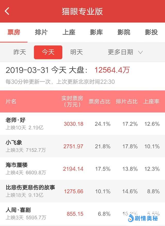 总的来说,《人间·喜剧》标注着喜剧片,片名还带着"喜剧"的字样,但如果去影院看,真的很悲剧了,不仅不好笑,而且没什么思想内涵,虽然比它早一星期上档的《老师·好》也是数次改档,片名也带标点符号,真的比它好看许多,不禁又回头看了下影片的排片和票房。昨日《人间·喜剧》拿到了最高的排片,达到23.2%,但票房占比只有11.3%,而在今天,《老师·好》遥遥领先,用17.2%的排片,拿下了24.1%的票房,《人间·喜剧》已经跌落到了第五,用16.2%的排片,收获了6.8%的票房,也就是说,两部影片排片相当,票房却是3030万和855万的巨大差别。没错,观众的眼睛总是雪亮的,他们会用电影票来为好的影片投票。