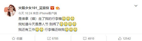 4月1日上午,吴宣仪发博称自己丢了行李箱,她写道:“是谁拿(错)走了我的行李箱,知道今天是愚人节 别闹了,我还有工作,行李箱还给我。”文末,吴宣仪还配上了12个大哭的表情,心情很是沮丧。
