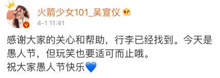 根据最新消息,吴宣仪已经找到了行李箱,不过她在微博却没提被偷这件事,而是称“今天是愚人节,但玩笑也要适可而止哦。”