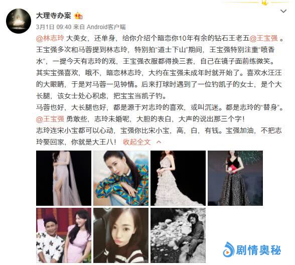那么王宝强暗恋林志玲的消息来源自哪里呢?还是马蓉的闺蜜“大理寺办案”。