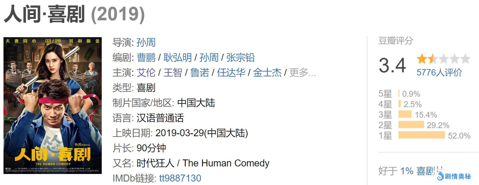 值得一提的是,这部《人间·喜剧》并不是开心麻花的作品,而是由导演孙周导演的一部国产喜剧片,请来了开心麻花的艾伦和王智,从这部电影的票房成绩,也可以发现,在离开了开心麻花之后,艾伦的票房号召力还是有一定的欠缺的。