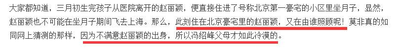 网上曾经有知情人爆料说冯绍峰父母看不上赵丽颖,因为她是农村出来的,出身背景不好,所以冯绍峰父母对赵丽颖有些冷漠。现在看的话,确实有这个嫌疑或可能性。甚至有人说当初赵丽颖是奉子成婚,发现怀孕后,公婆家才勉强同意他们结婚的。