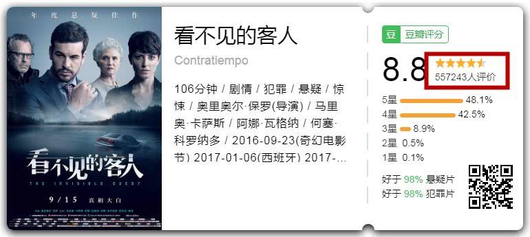 凭借精彩的剧情,《看不见的客人》最终在中国揽收1.72亿票房,成为小语种影片中的黑马。