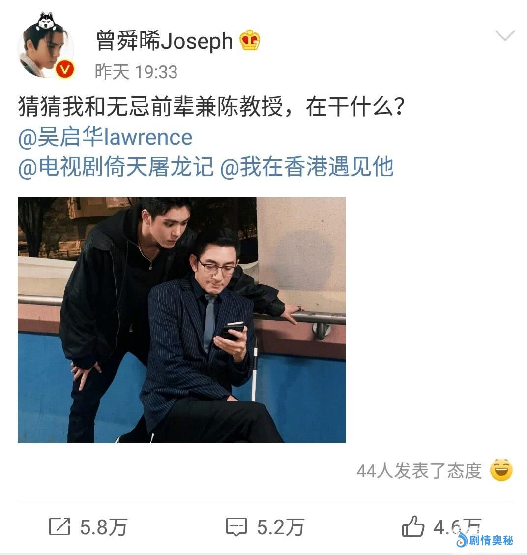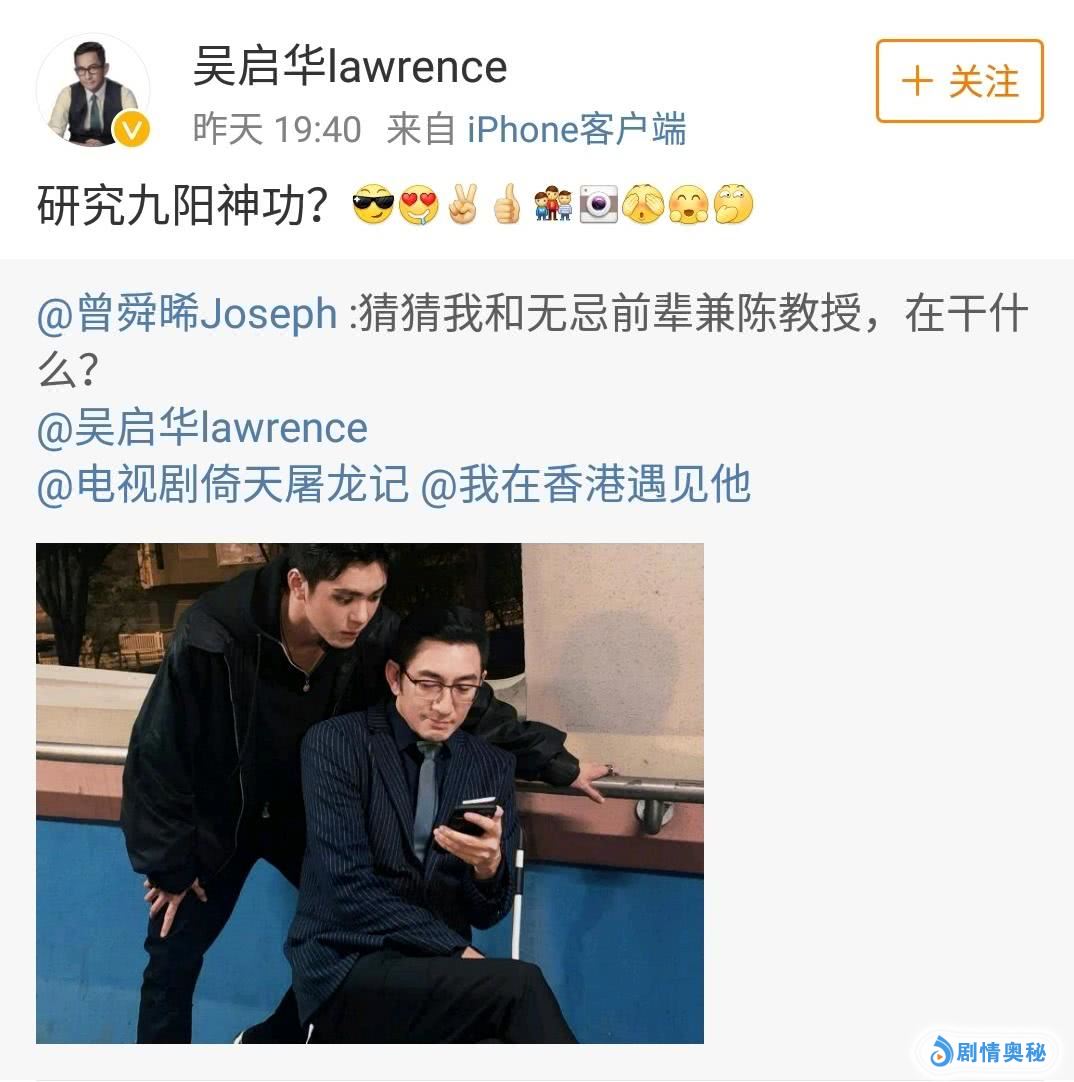 曾舜晞在微博上发了一张自己与吴启华同框的照片,并配文道“猜猜我和无忌前辈兼陈教授在干什么?”看到晚辈的微博发文,吴启华也幽默地回应道,“研究九阳神功?”并配发许多可爱的表情,十分有爱。
