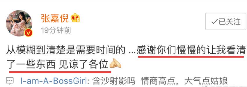 4月1号晚上,被舆论推到风口浪尖的张嘉倪回应了采访争议,她说:感谢你们慢慢地让我看清了一些东西,见谅了各位!看清了什么东西?这个语气明显是不服气,夹杂着暗中鄙视的含义。网友呛声说:含沙射影吗?情商高点,大气点姑娘!好好说话不行吗?都跟吃枪药似的!吃这口饭不受这口气。