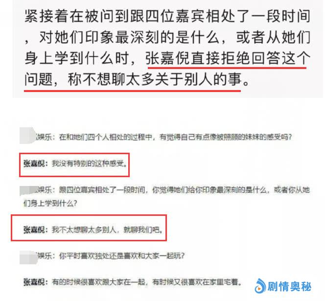 张嘉倪先是埋怨自己在节目上没有像妹妹一样被照顾,后来记者问她对其他女嘉宾印象最深的是什么?结果张嘉倪脱口而出说不想聊太多这个问题,当场拒绝回答记者问题。节目上都在一起录制,现在居然说不愿意聊章子怡谢娜等人,这是坐实塑料姐妹情吧,网友怒斥张嘉倪采访耍大牌。