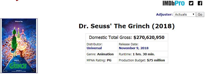《绿毛怪格林奇》同样成为了“爆款”,影片登陆北美电影院线后,收获了相当惊艳的票房,北美票房高达2.7亿美金,甚至击败了《碟中谍6》,成为北美年度票房第七名!