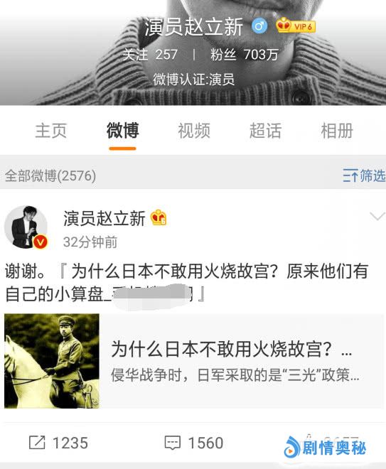 演员赵立新人设崩塌了,因为他三观不正,立场有问题,居然光天化日之下替日本鬼子洗白,这种人还配做演员吗?不要觉得笔者说话太狠太直接,面对这种污点艺人,就不要手下留情,因为他太过了。看下图,赵立新居然发文日本人侵略我国时为什么没抢走故宫文物,还问为什么没烧掉故宫,厚颜无耻说这不符合侵略者本性。