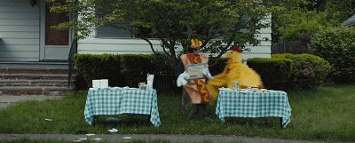 在街边卖炸鸡,穿着巨大的玩偶服,卖力地推销。