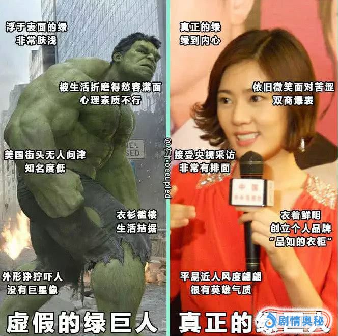 绿巨人之绿,肤浅至极,就像刷了一层绿油一样。而且说起来是巨人,然而实际上是个长不大的小孩。真正的绿巨人,有着巨星的面孔,而绿则是绿到骨子里的绝对之绿,前者根本没有可比性。