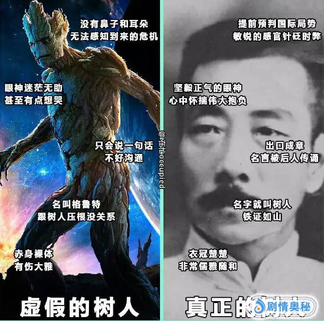 真正的树人,你懂的,毕竟他名字就是树人,而银河护卫队中的这位,甚至只会一句话。