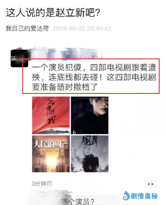 4月2号晚上,有大号爆料:赵立新今天的言论,导致四部戏要准备随时撤档。其中包括张译、赵立新的《光荣时代》,刘亦菲、井柏然的《南烟斋笔录》,靳东、闫妮、陈晓、秦岚等的《人民的财产》,徐璐、文咏珊的《风声》。