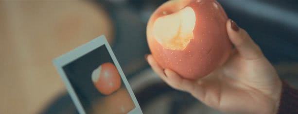 在等待照片显影的过程中,小红拿起苹果咬了一口。