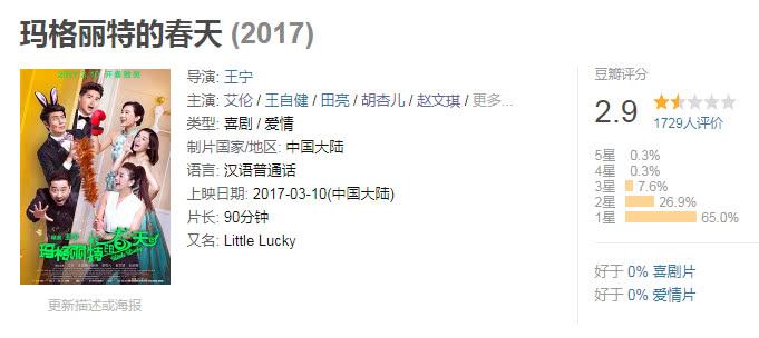 正因为这些槽点,《玛格丽特的春天》口碑崩盘的彻底,豆瓣评分仅2.9,刷新了艾伦电影评分最低纪录,堪称烂片界的“标杆”