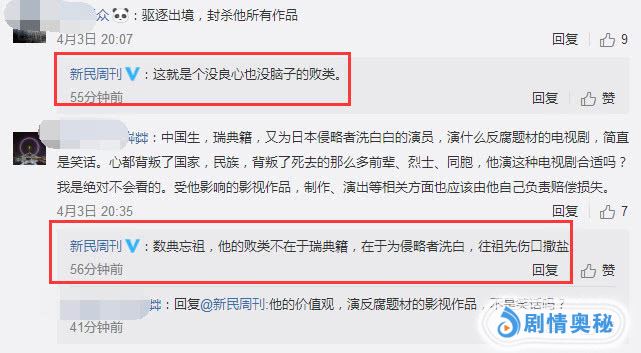 对于驱逐出境的建议,网友表示支持:这个可以有,抛弃了自己祖国的人,不必怜悯他!新民周刊官博回应:换国籍是个人自由,但数典忘祖,帮侵略者洗白,侮辱祖先,这就相当败类了!网友怒斥赵立新:没有脑子的人就不要怪他疯言疯语了。官博再次回复:想炒作想疯了。