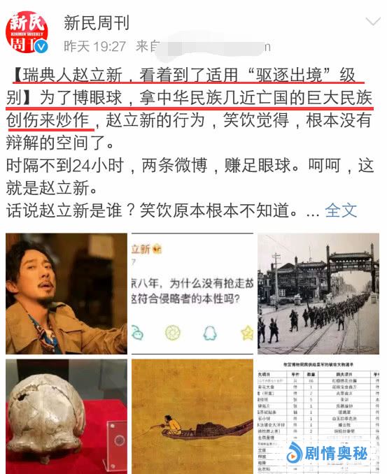4月3号晚上,新民周刊官博表态说:为了博眼球,拿中华民族几近亡国的巨大民族创伤来炒作,赵立新的行为,根本没有辩解的空间了。