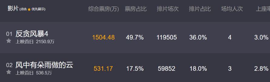 4月4号周四有三部新片上映,其中古天乐的《反贪风暴4》一上映就击败了之前的票房冠军于谦《老师好》。截至4号9点《反贪风暴4》拿下了1504万票房,首日排片高达36%,票房占比49.7%。以绝对的优势夺得内地日票房冠军!
