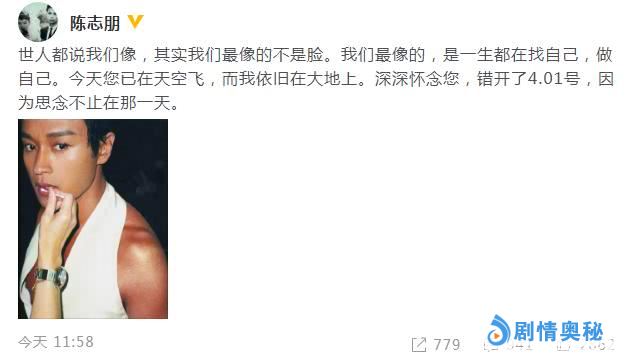 陈志朋在文中还缅怀了张国荣,称“今天您已在天空飞,而我依旧在大地上。深深怀念您,错开了4月1日,因为思念不止在那一天”。