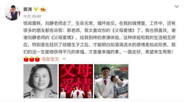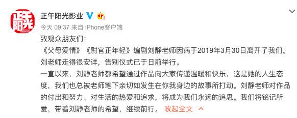 今天早晨,演员郭涛、李佳航个人微博,正午阳光官方微博均更文哀悼一个人的离去,她就是电视剧《父母爱情》的编剧——刘静