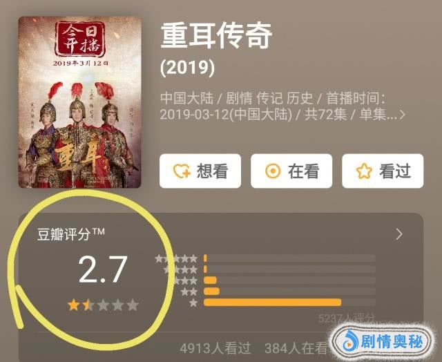 盘点2019年已出品的烂剧,《重耳传奇》豆瓣评分跌至令人发指的2.7分,高居榜首。
