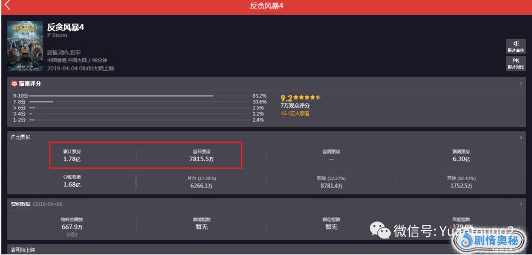 从猫眼专业版实时票房数据显示,影片《反贪风暴4》于4月4日热映,首日票房拿下了高达7765.2万,而截至发文时间,影片累计总票房也已经突破1.7个亿,虽然被4月5日上映的DC力作《雷霆沙赞!》挤下日票房榜首,但是高达28.9%的排片占比同样势不可挡。但是,在票房日趋渐长的同时,影片口碑上却出现了两极化,猫眼和豆瓣分别给出了9.2和6.3的差异评分。