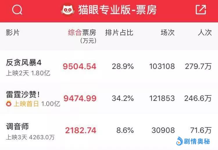 《反贪风暴4》实时票房超过《雷霆沙赞!》
