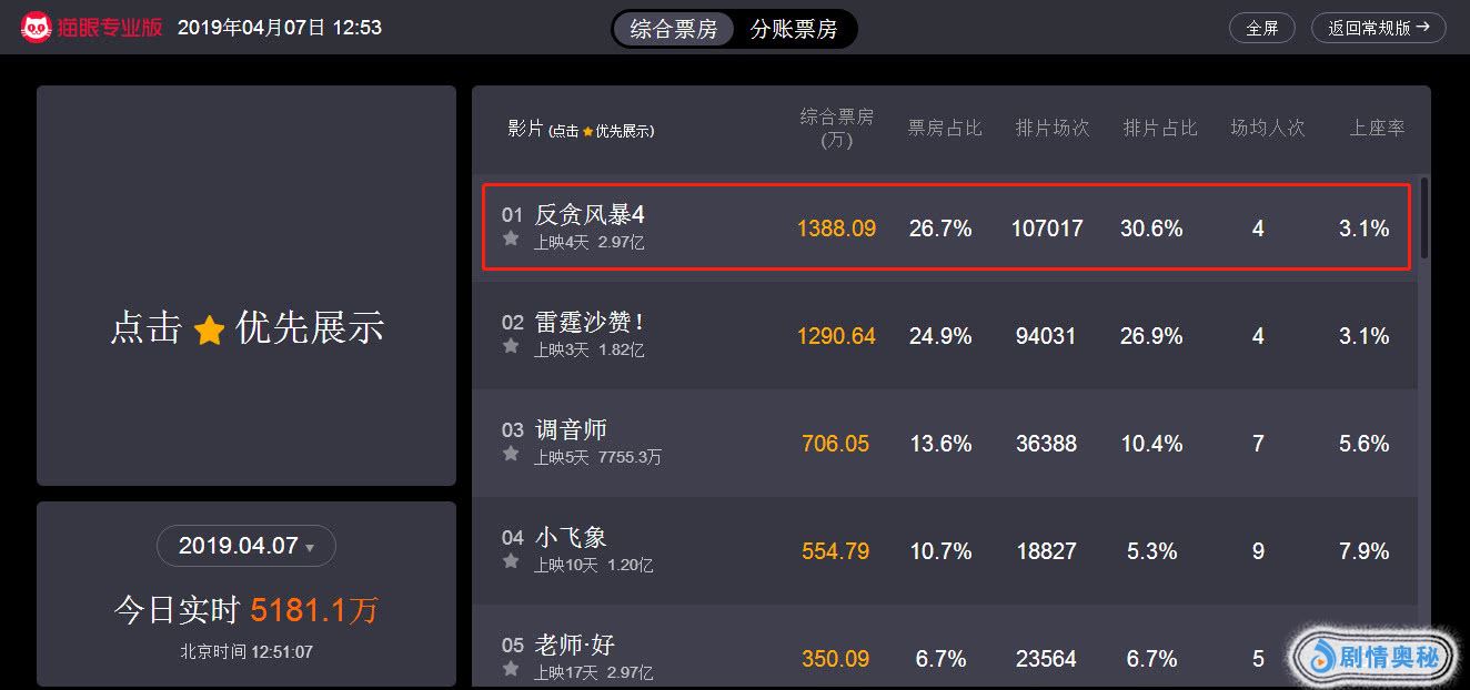清明档假期三天即将逝去,但是各大影院观影人数依旧络绎不绝。在这清明档时期,虽然没有贺岁档大片云集,可也是一度硝烟四起。除了港片反贪系列作品《反贪风暴4》,还有美国DC力作《雷霆沙赞!》,以及国产文艺片口碑佳作《风中有朵雨做的云》等多部影片。而从猫眼专业版实时票房数据显示,在众多影片中,最受欢迎的莫过于古天乐、林峯主演的反贪系列第四部—《反贪风暴4》。