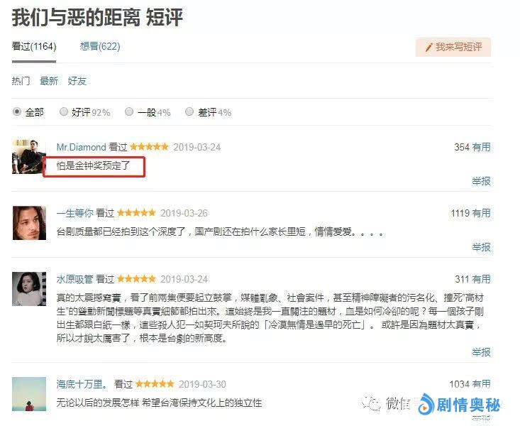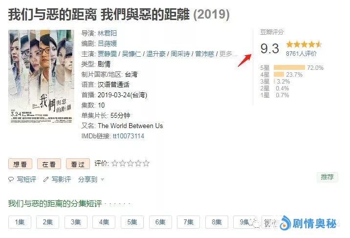 电视剧《我们与恶的距离》主要是由导演林君阳执导,贾静雯、吴慷仁等人主演,主要是围绕着一场无差别杀人事件为开局,从中延伸除了几个家庭之间,不同立场、不同参与者的一系列故事,从而引发观众共鸣和深思。该剧于2019年3月24日在中国台湾以及HBO同步播出。仅在更新前两集的情况下,该剧一度以豆瓣9.4开画(如今降到9.3分),多达八千多人的点评中,四星以上好评的占据了95.7%,几乎是做到了零差评,甚至还有网友一度评价到:年度金钟奖预定了。