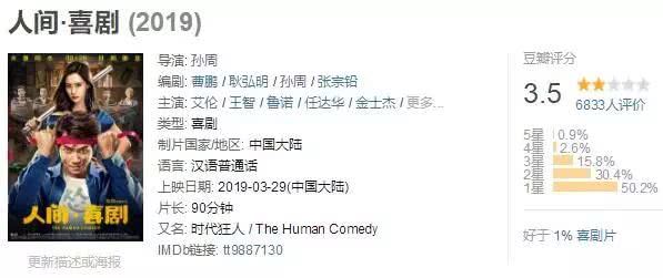 《人间·喜剧》豆瓣评分才3.5分,一星差评超50%,好于1%的喜剧片,如此惨不忍睹的口碑,可谓烂到飞起。