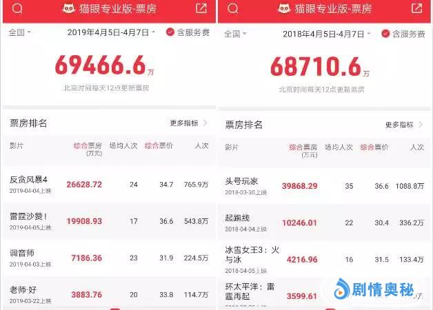 不过,由于今年清明档原本最被看好的好莱坞超级英雄大片《雷霆沙赞》表现不佳,大盘报收6.94亿元,仅比去年同期的6.87亿元小幅增长1%,算是勉强走出了内地影市自3月份以来的低迷表现。