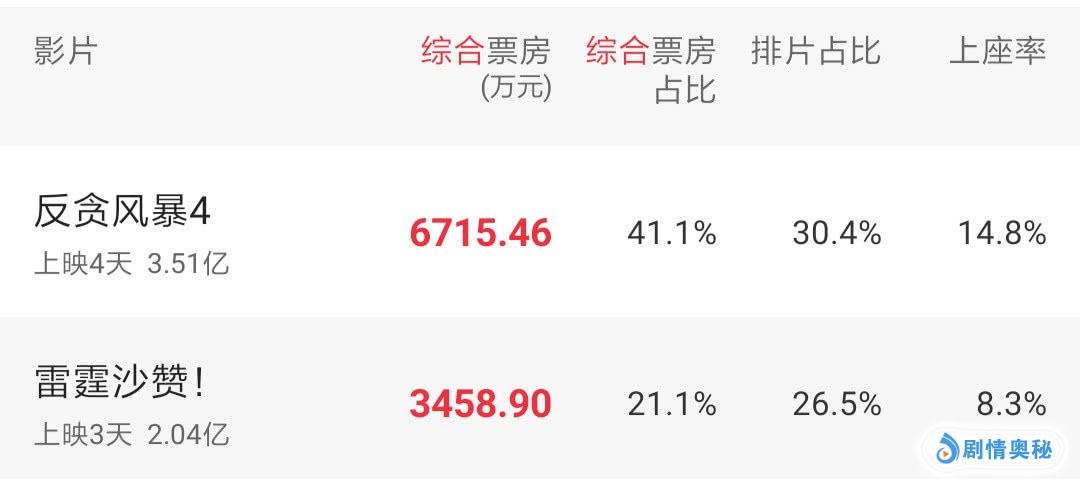 《反贪风暴4》表现完全能用”疯狂“两个字形容,昨日票房高达6715万,票房占比超过4成,力压DC大片《雷霆沙赞》,连续4天蝉联单日冠军