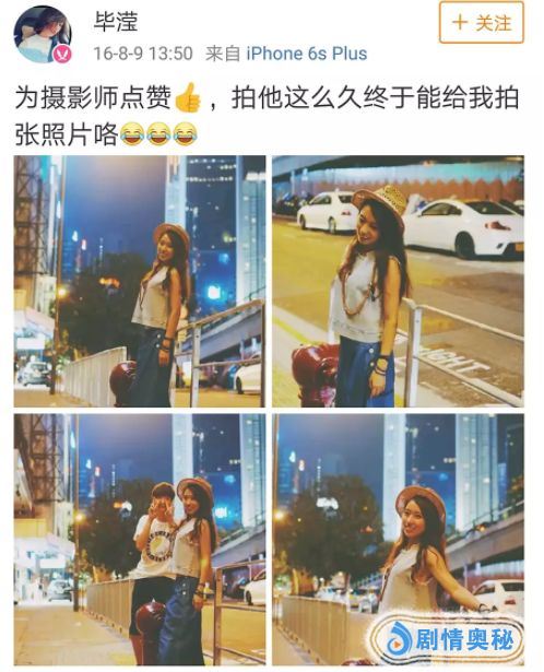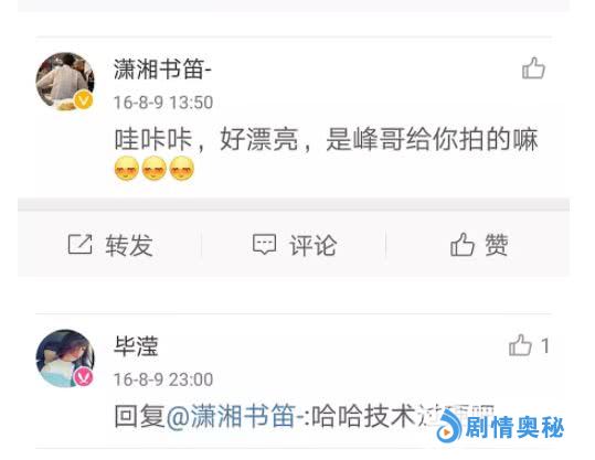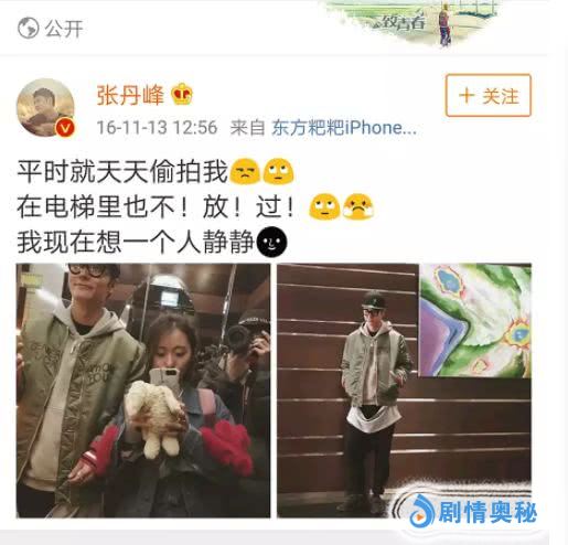 毕滢一直在微博cue张丹峰,有段时间嫌弃他拍照太丑,在自己的调教下,拍照技术慢慢有了进步。