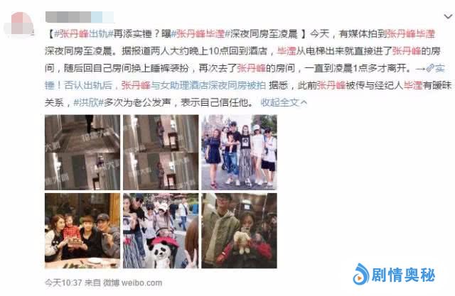 张丹峰和助理毕滢在2018年7月底的时候,因为一张照片,被网友们扒出两人微博互动频繁,不像是单纯的同事关系,而被顶上了热搜榜,那时工作室发声明否认传闻,洪欣更是不遗余力的帮老公和毕滢解释。