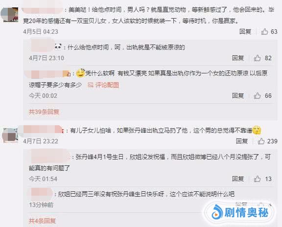 有网友觉得洪欣应该给他点时间,等他新鲜感过了,自然就会回来,还称女人该软的时候就装一下,等待时机,你就是赢家。但大部分网友称:凭什么软,有钱又漂亮,不值得原谅。还有网友表示有儿子女儿怕啥,如果张丹峰出轨立马扔了他。