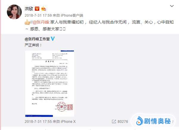 之后张丹峰工作室发了严正声明,张丹峰表示家人与我幸福如初,经纪人与我合作无间,流言、关心,心中自各,感恩、感谢大家,洪欣之后转发,表示赞同。但仅仅一个声明,无法平息网友们继续吃瓜和寻找他们网络上的蛛丝马迹,于是很少出现在镜头前的洪欣,带着老公接受了媒体采访。