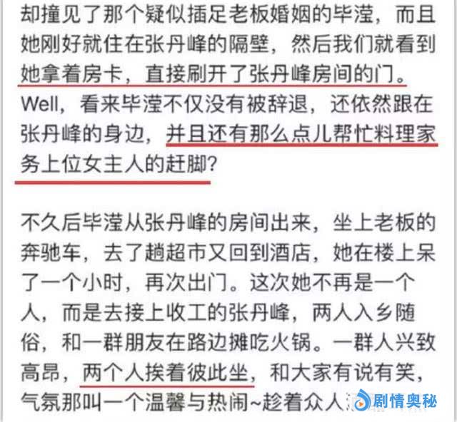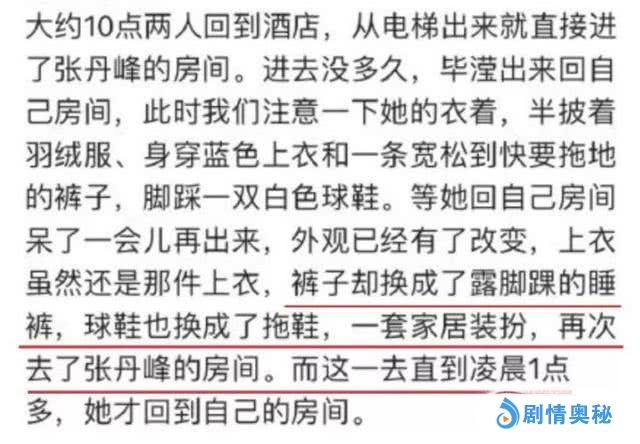 爆料文中,指酒店中毕滢住在张丹峰隔壁,而且随意刷卡进入,有点“帮忙料理家务上位女主人的赶脚”。此外,毕滢出门购物乘坐张丹峰的奔驰车,吃火锅时与张丹峰挨着彼此坐。最重要是的回到酒店后,毕滢换上睡裤、拖鞋,在张丹峰的房间内呆了3个多小时,一直到凌晨1点多才回到自己房间。