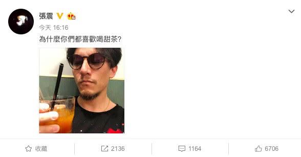 近日,张震发微博晒出自拍照,并配文问:“为什么你们都喜欢喝甜茶?”之前曾有报道过说张震正在商谈出演《沙丘》,该片男主角人选已敲定为“甜茶”蒂莫西·柴勒梅德,看来现在八九不离十了。