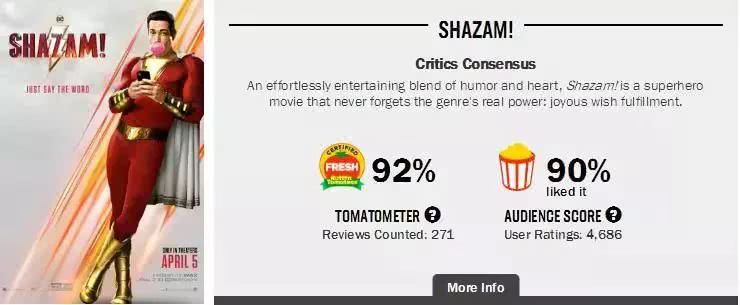 毕竟映前,《雷霆沙赞!》可谓“口碑炸裂”——北美地区试映后该片收到的赞誉不断,“烂番茄”评分解禁后更是直接以93%的数据认证新鲜,达成当时DC电影宇宙的最高分(目前该评分回落至92%),超越《神奇女侠》,完爆《海王》,成为DCEU新一哥。