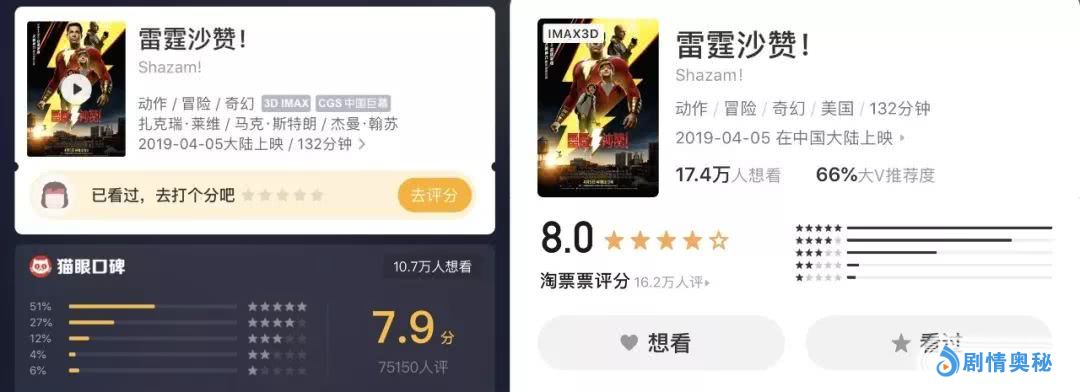 《雷霆沙赞!》在猫眼和淘票票平台上的评分