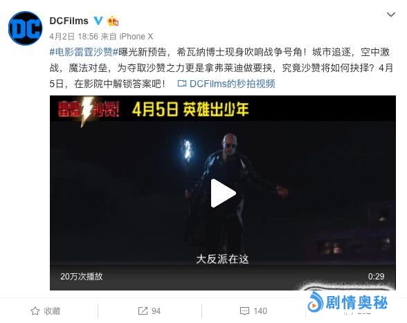 《沙赞》物料在微博上的传播度远低于《小丑》等DC其他电影物料