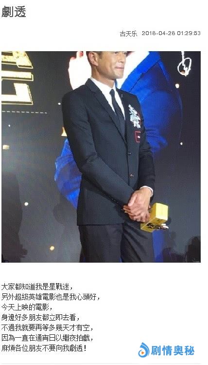 去年《复仇者联盟3》上映,古天乐还特地在微博请求网友不要剧透,因为他当时太忙,没办法第一时间去看电影。