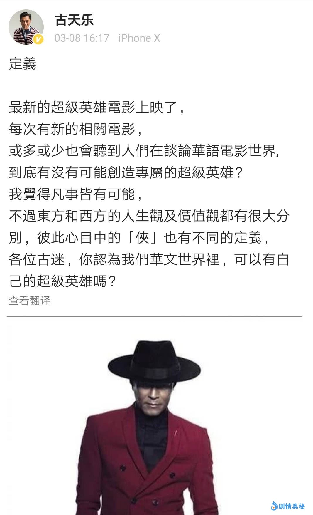 事实上,古天乐也是一枚漫威的铁杆粉,“漫威之父”斯坦·李去世,他发文“相信他只是离开了这个空间,去了另一个平行宇宙继续创作”。