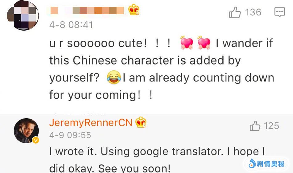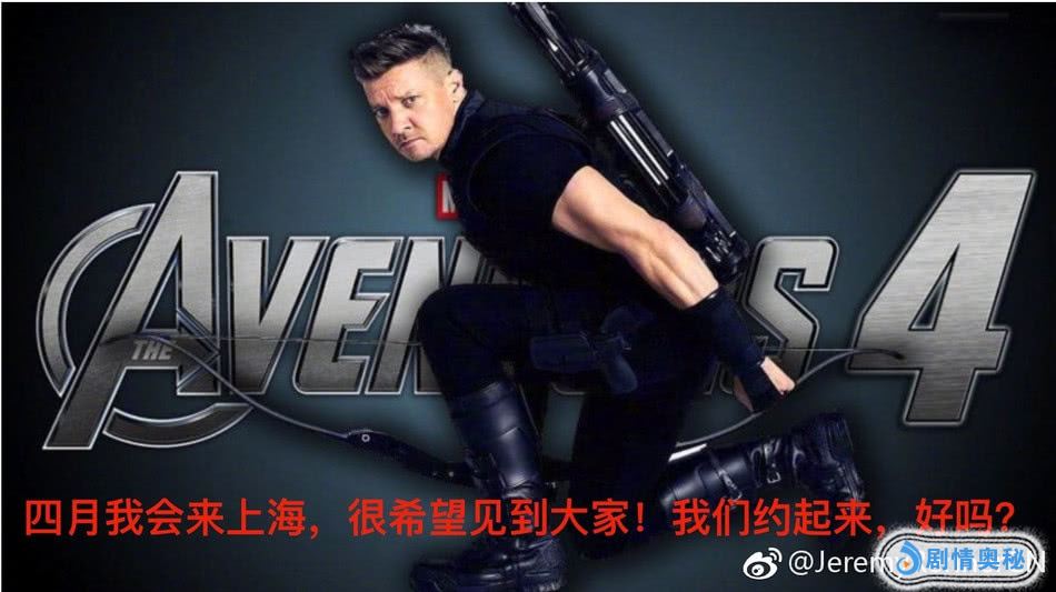 最近一段时间,在漫威电影中饰演“鹰眼”的演员杰瑞米·雷纳在微博上比较活跃,频频和中国的网友们进行互动,吸引了大家的关注,毕竟《复仇者联盟4:终局之战》4月24日就要上映了。