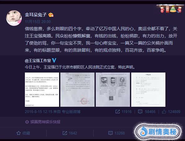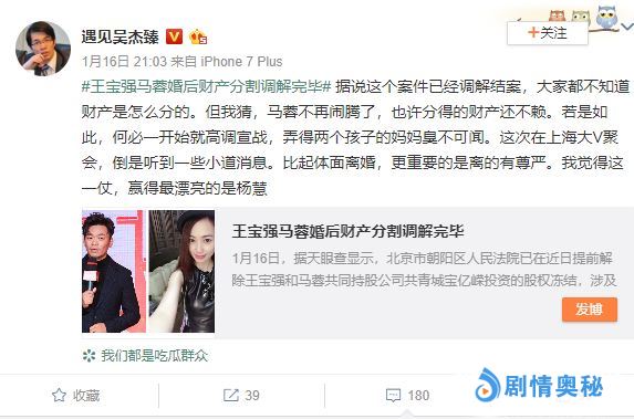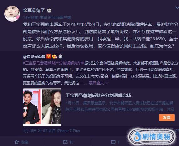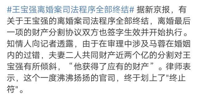 4月9日,马蓉发博称:“我和王宝强的离婚案于2018年12月24日,在北京朝阳法院调解结案,最终财产分割是按照我们双方意愿协议后,到法院签署了最终协议,并不存在财产倾斜这一说法。最后诉讼费和其他所有的费用,我承担一半,我一共转给他231690。至于雷声那么大搞成这样,最后匆匆收场,值不值得应该问问王宝强,到底为什么?”