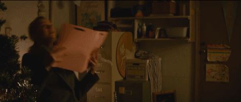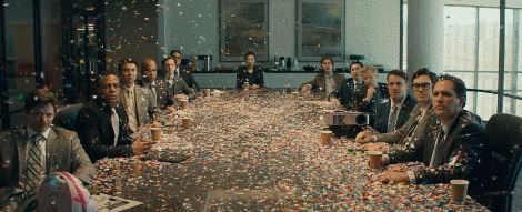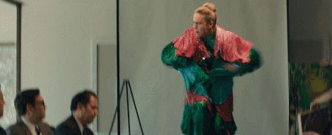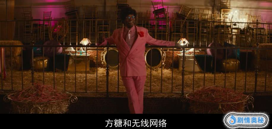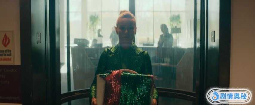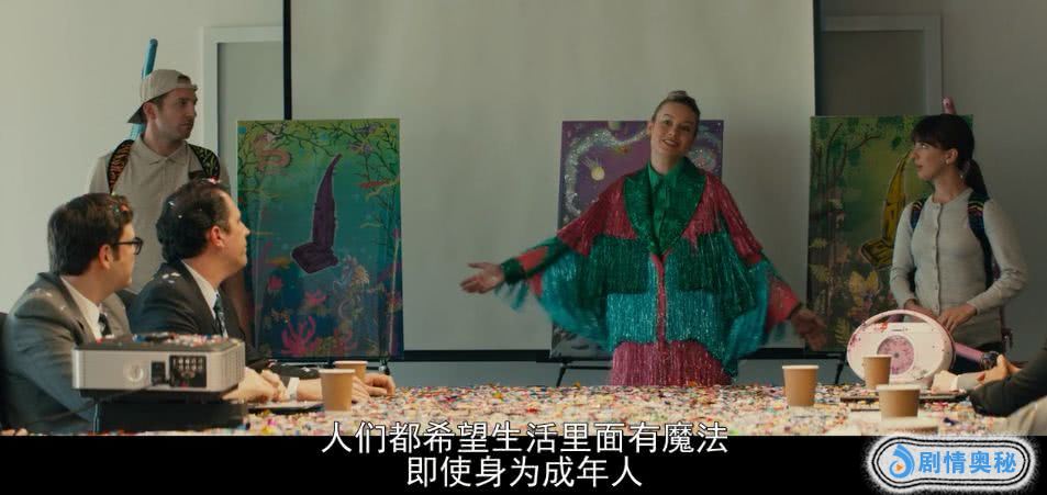 在这一个镜头,漫天飞舞的彩纸,红红绿绿的奇装异服,和黑色西装的商人形成了强烈的对比。