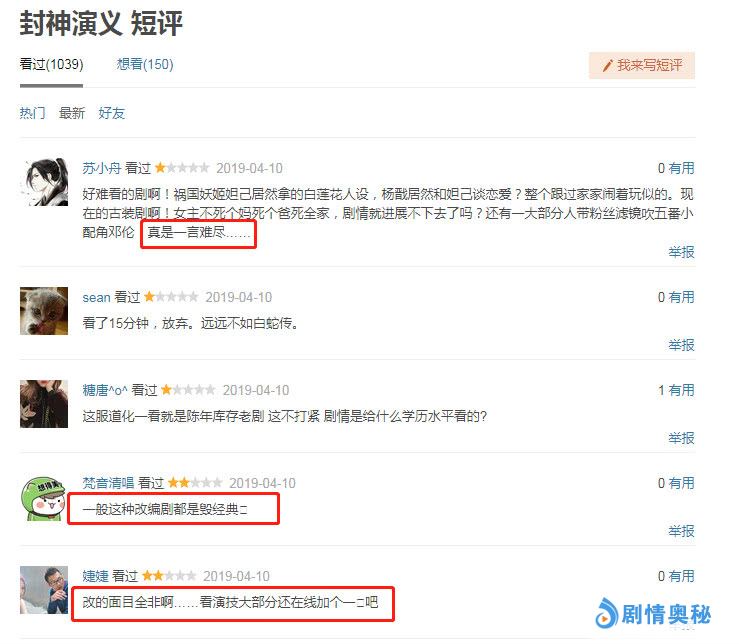 总而言之,不反对改编名著,但也得有板有眼,搞成这个原著粉都不能够直视了,还配叫剧名“封神演义”这四个字吗?在《封神演义》还未热播之前,我还一度以为于朦胧、鞠婧祎版《新白娘子传奇》就够毒害观众眼球了,没想到刚过两天重新刷新了我的三观,真的叹息到,国产翻拍剧真的是毫无底线,除了圈钱,完全没有考虑到观众的感受,一味的将以往的多部经典剧在观众脑海中的记忆全部清空到一无所有。