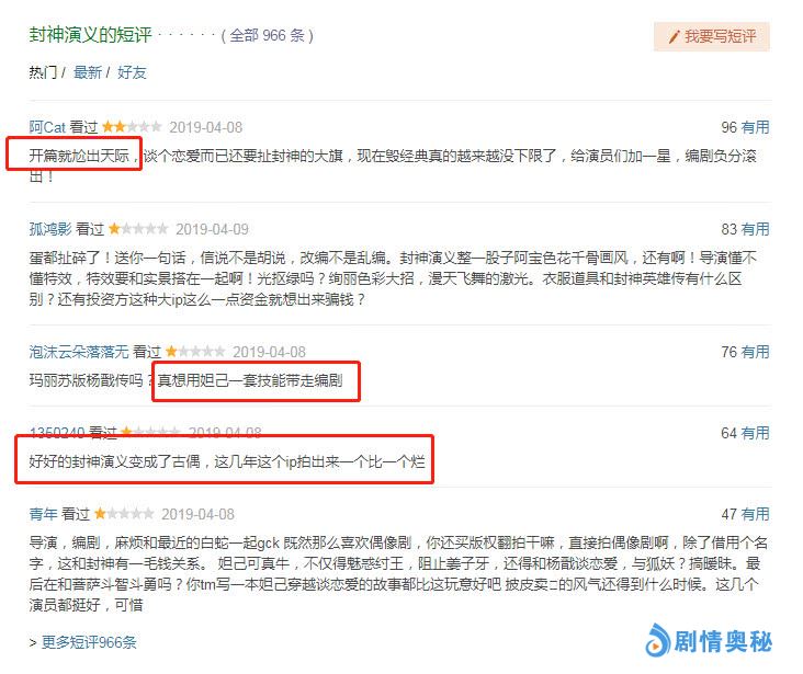 在目睹《新白娘子传奇》扑街后,或许观众对于翻拍剧就不报太大希望,甚至还产生了抵触心理,导致刚刚热播的《封神演义》在热播不久后,剧集质量上就遭遇了观众质疑,而且在豆瓣网上更是出现了清一色一星差评,甚至还有网友吐槽到该剧“开篇就尬出天际,谈个恋爱而已还要扯封神的大旗,现在毁经典真的越来越没下限了,给演员们加一星,编剧负分滚出!”这样的评论,简直令人不忍直视。