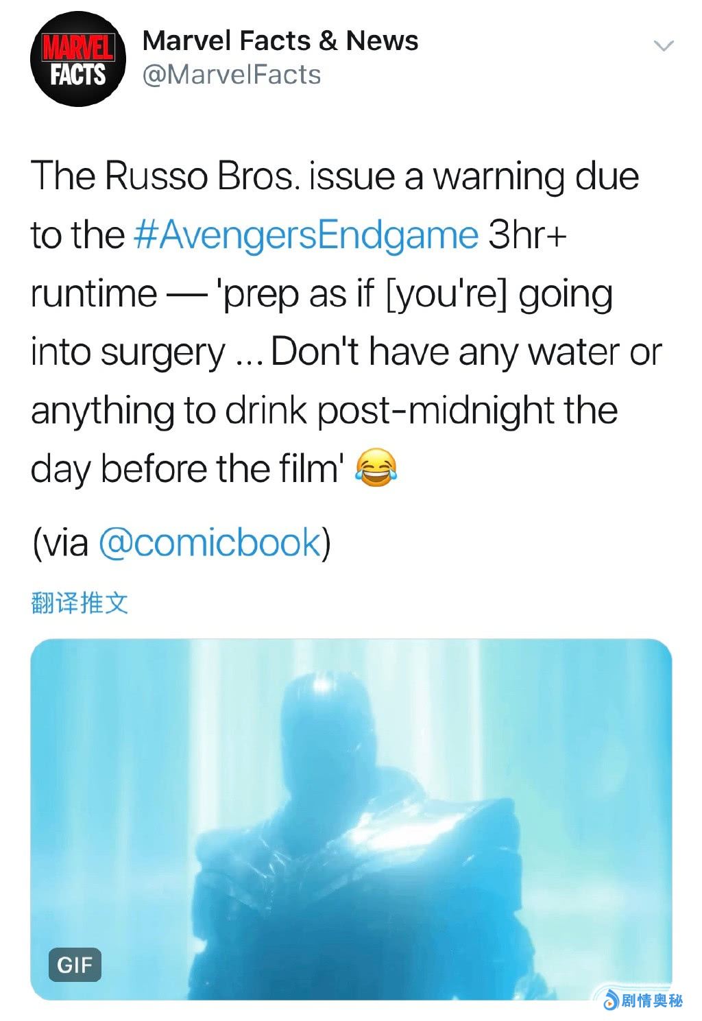 就在前不久,《复联4》的导演罗素兄弟在社交平台上预告观众:“由于《复联4》时长3小时多,如同要做手术一般,因此请观众不要在观影前摄入任何水分!”
