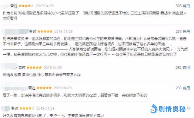 虽然现在豆瓣评分还没有出来,但从现在的评论来看,四星五星的好评还是挺多的,能不能达到7分、8分的好口碑,还要看后面剧情的发展,和演技的稳定发挥。