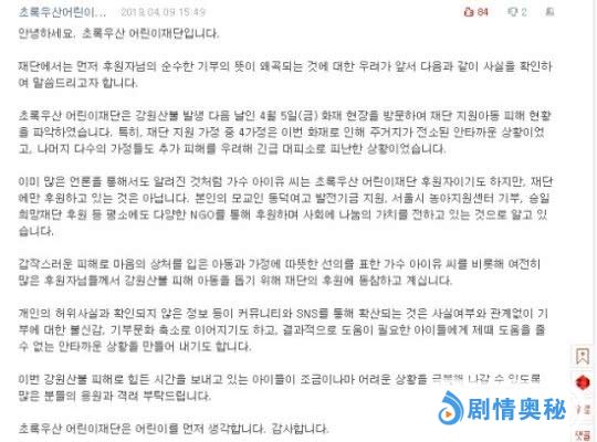 接着,财团还表示:“歌手IU向因突如其来的灾害而遭受心灵创伤的儿童和家庭表示了温暖善意。除了她之外,还有很多后援者为了帮助江原道山火受害儿童正在共同参与财团的支援活动”。财团指责道:“像这样通过网络社区和SNS扩散个人的虚假事实和未经确认的信息等的行为,不管是否属实,都会引发群众对捐赠的不信任感,破坏捐赠文化,最终造成无法及时帮助需要帮助的孩子们的遗憾情况。”